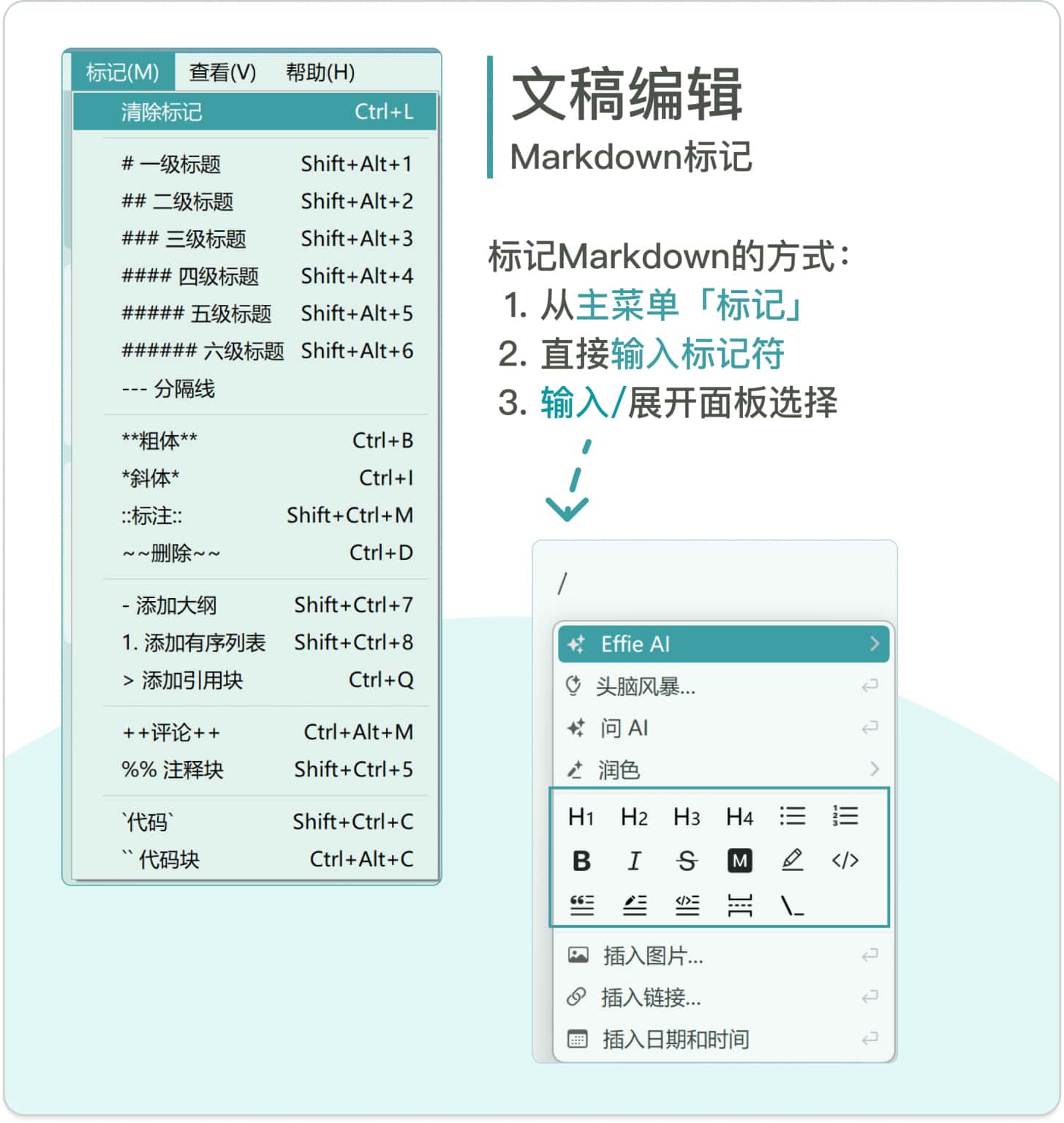支持Markdown(多级标题、分隔线、粗体、斜体、标注、删除线、大纲、有序列表、引用、评论、注释、代码、代码块)