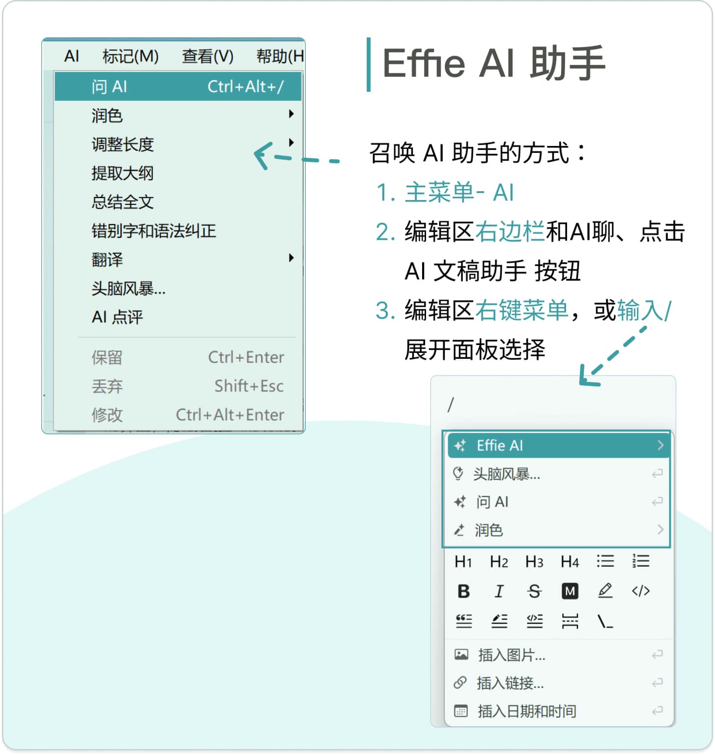 功能菜单(主菜单、编辑区右键菜单、右边栏 AI 文稿助手菜单)