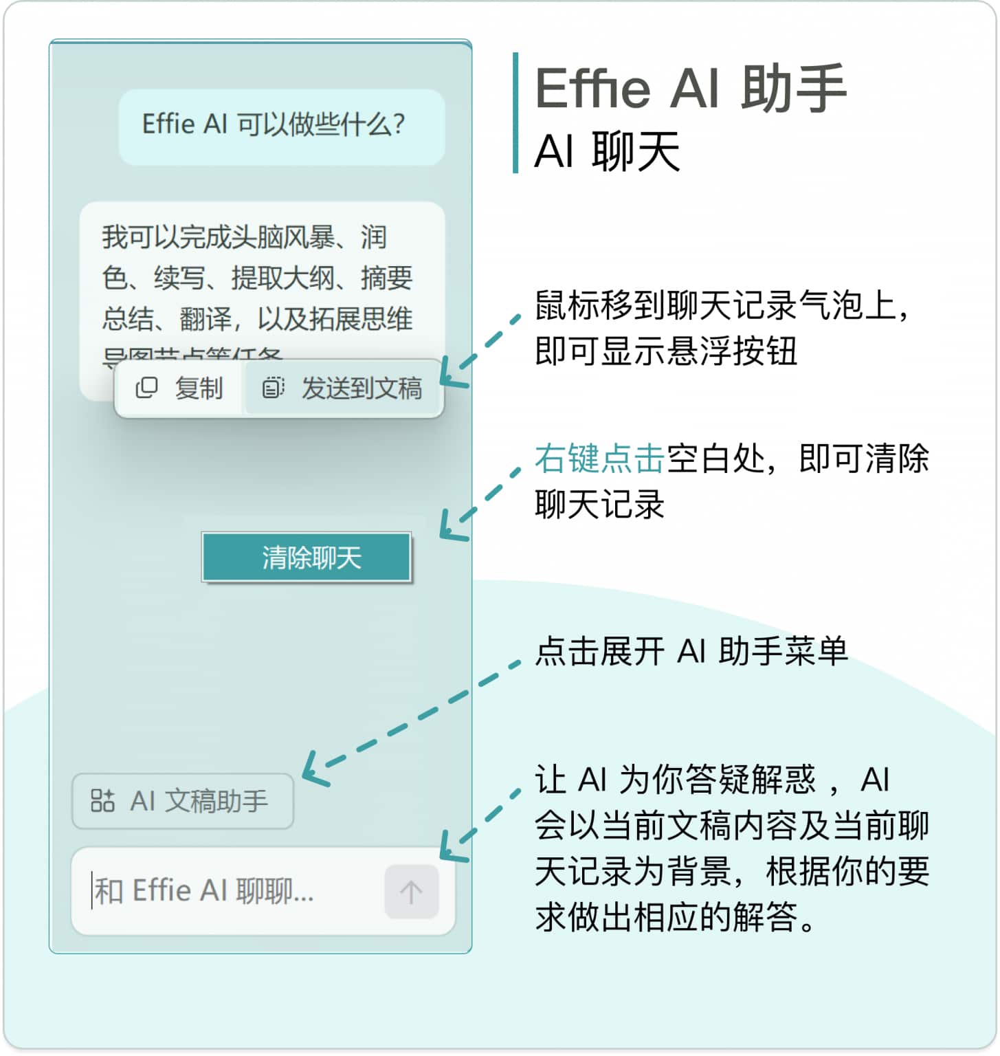 AI 聊天栏(右边栏):可清除聊天内容、复制、发送到文稿