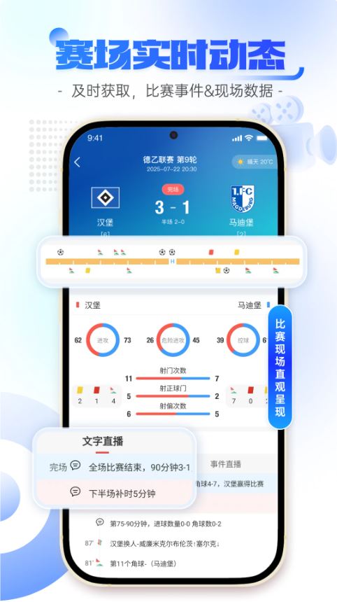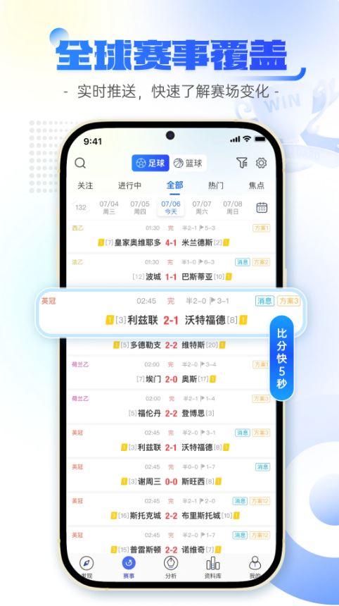 覆盖全球联赛/杯赛的赛程、实时比分、红黄牌动态及球员数据。