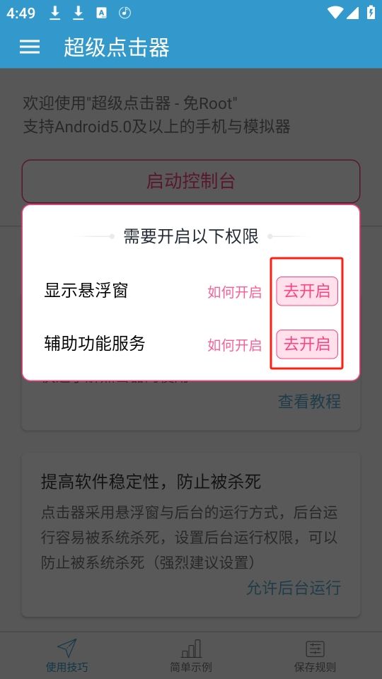 1、打开超级点击器app,通常会提示需要开通显示悬浮窗”功能和辅助功能权限。根据系统提示,将这两个权限设置为允许或打开状态