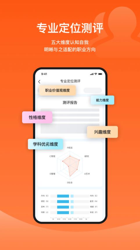 用户在软件中也可以进行专业的智能测评,轻松测试自己的就业倾向等。