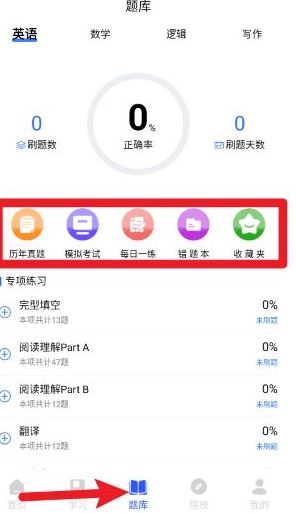 4、进入“题库”页面后可进行历年真题、模拟考试、错题本等专项练习提高答题效率。
