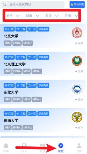 5、在“院校”栏目中可根据省份、城市、专业、性质等条件筛选目标学校与研究方向。