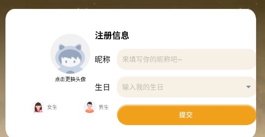 3、之后就可在“注册信息”界面中来填写自己的呢称和生日,点击“提交”按钮来进行下一步。