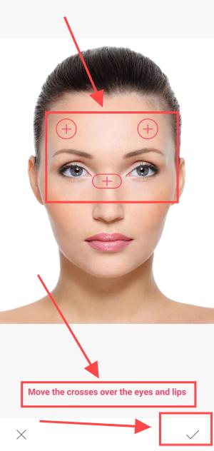 2、点击Makeup化妆功能,把三个加号分别移动到眼睛和嘴巴上后,点击右下角的勾号。