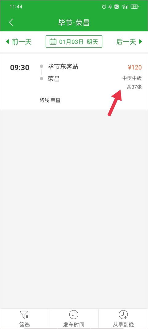 3、如果当天没有汽车票预定的话,可以选择后一天进行预定操作,页面显示了从出发地到目的地这个行程的车票数量和价格,点击其中一个。