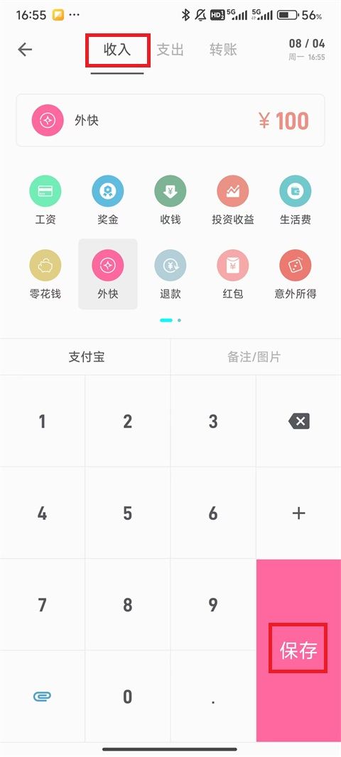 9、同理,点击左上角的“支出”,记录收入项,随后点击右下角的“保存”。
