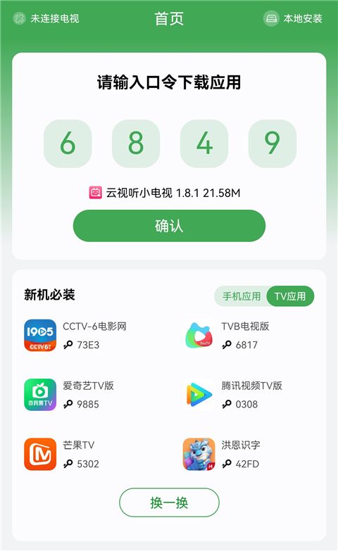 1、点击此处前往下载野草助手App,打开该软件,输入想安装软件的口令码,如6849(云视听小电视),点击【确认】。