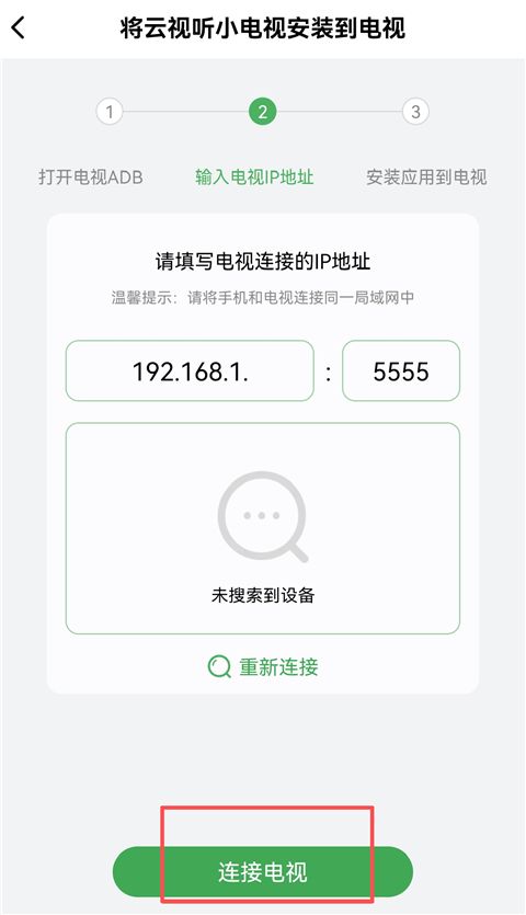 4、打开后,输入电视的ip地址,点击下方的【在哪里查看IP地址】可看到查看方法,点击【连接电视】,连接到电视后,即可开始下载。