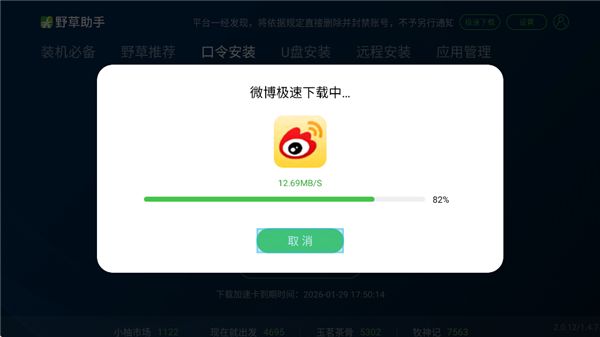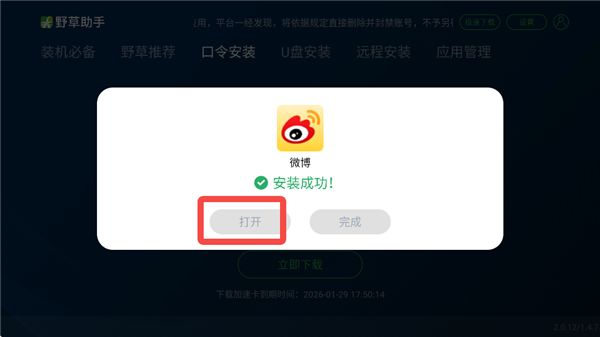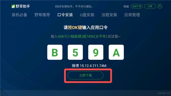 6、在电视上打开野草助手,输入口令码,点击【立即下载】。