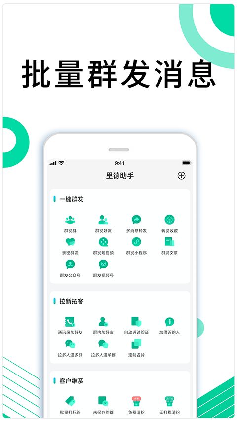 里德助手app还拥有强大的辅助功能,支持一键群发、批量打标签、群发群、群发文章、群内批量加好友、朋友圈点赞等,是你日常必备的微商神器。同时里德助手还内置海量网络头像,可以订制有个性的头像框,让微信头像可以变得更个性、更好看。