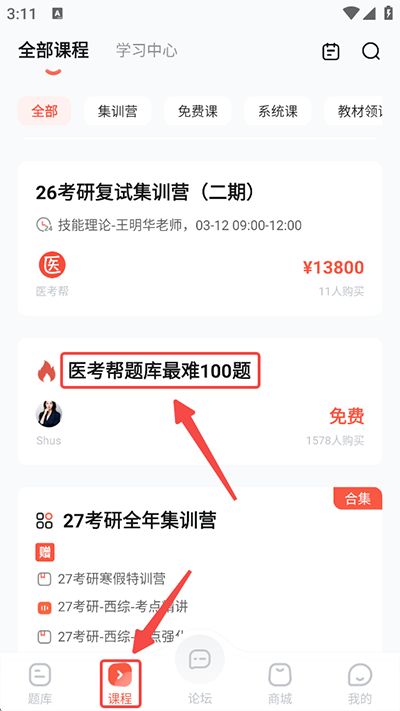 1、用户在本站下载并打开医考帮app后,点击下方“课程”进入,选择准备下载的课程内容。