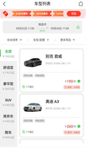 6、所有车型在软件中都可以搜索到,价格都是非常合理的,能够随时租到自己心意的自驾车型。