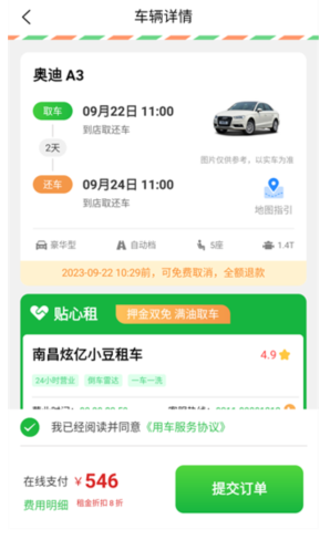 5、选择完成后,提交订单然后付款即可完成,随后会有官方联系您取车事宜,非常方便!