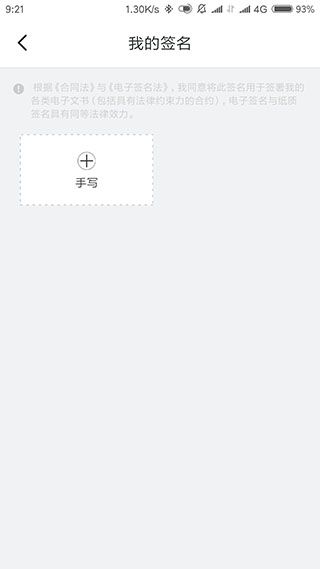 2、点击“+”进入手写页面。注意:你将默认同意将此签名用于签署你的各类文书,与纸质签名具有同等法律效力。