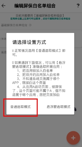 4、进入编辑屏保白名单组合,点击基础屏保白名单组合,再弹出窗口中,选择“普通选取模式”。