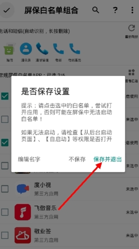 5、然后勾选打算添加的应用,选择完毕后,点击左上方的“√”,在弹出窗口中点击“保存并退出”。