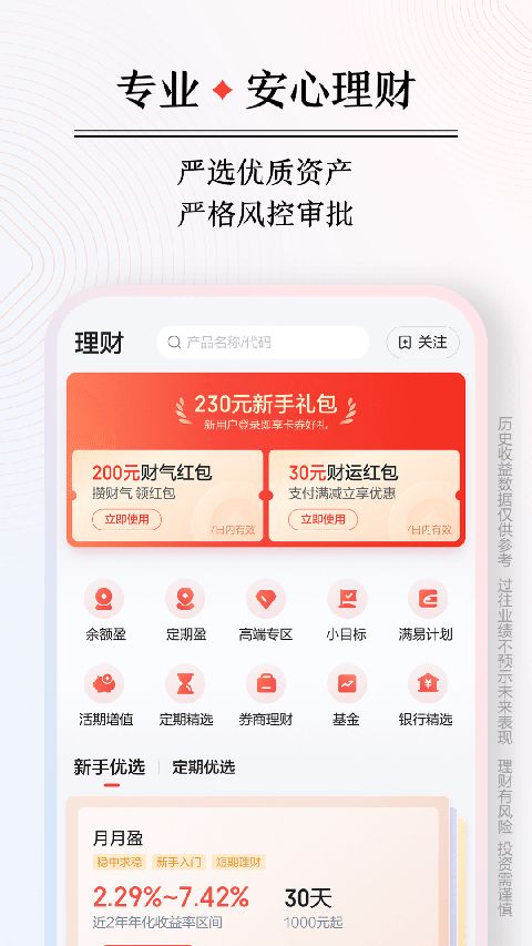 1、提供活期、定期、基金投资,收益稳健、存取灵活、安全有保障。