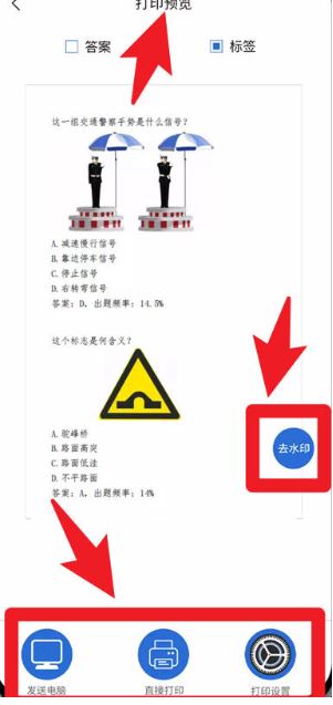 2、在打印预览页面支持去水印,并可将试题发送至电脑、直接打印或进入打印设置。