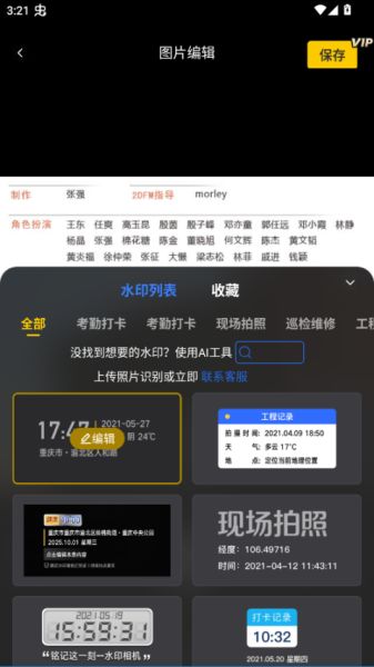 4、水印模板市场: 海量水印模板,适用多场景拍照、打卡、记录,包括施工信息、时间地点、会议记录、宝宝成长记录等水印模板。 可在水印市场中看到其他用户的DIY水印,均可免费试用。 在常用水印模板中可一键使用常用模板,下次使用更方便。