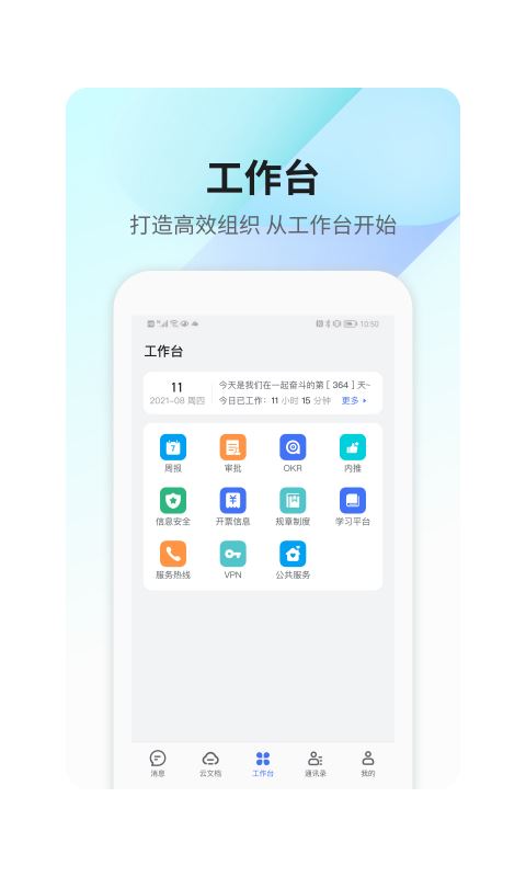 - 工作台集周报、开票信息、规章制度等多个工作窗口于一身,提供高效团队工作