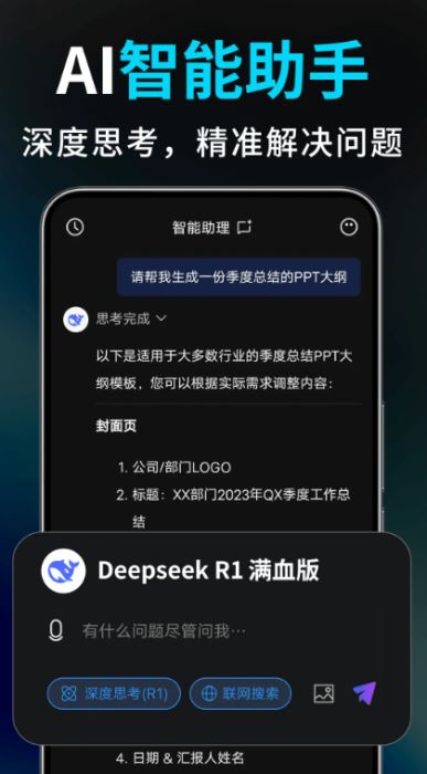 旗舰级 R1 推理内核驱动,回应速度像闪电、答案精准又专业。只管抛出问题,AI聊天全能助手转瞬奉上完整方案。