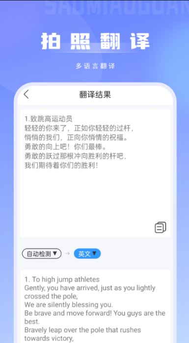 扫描翻译:可提取各类资料上的文本:文件、书籍、说明书或公告将文本拍照,文本被识别后,可对其编辑、翻译、分享。