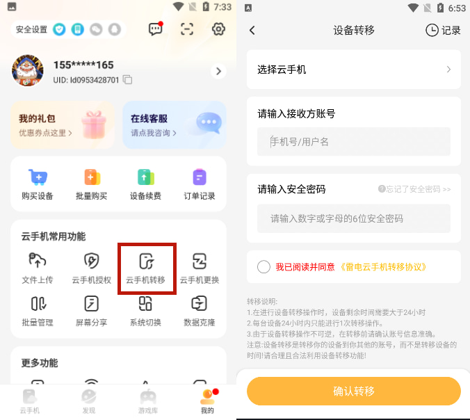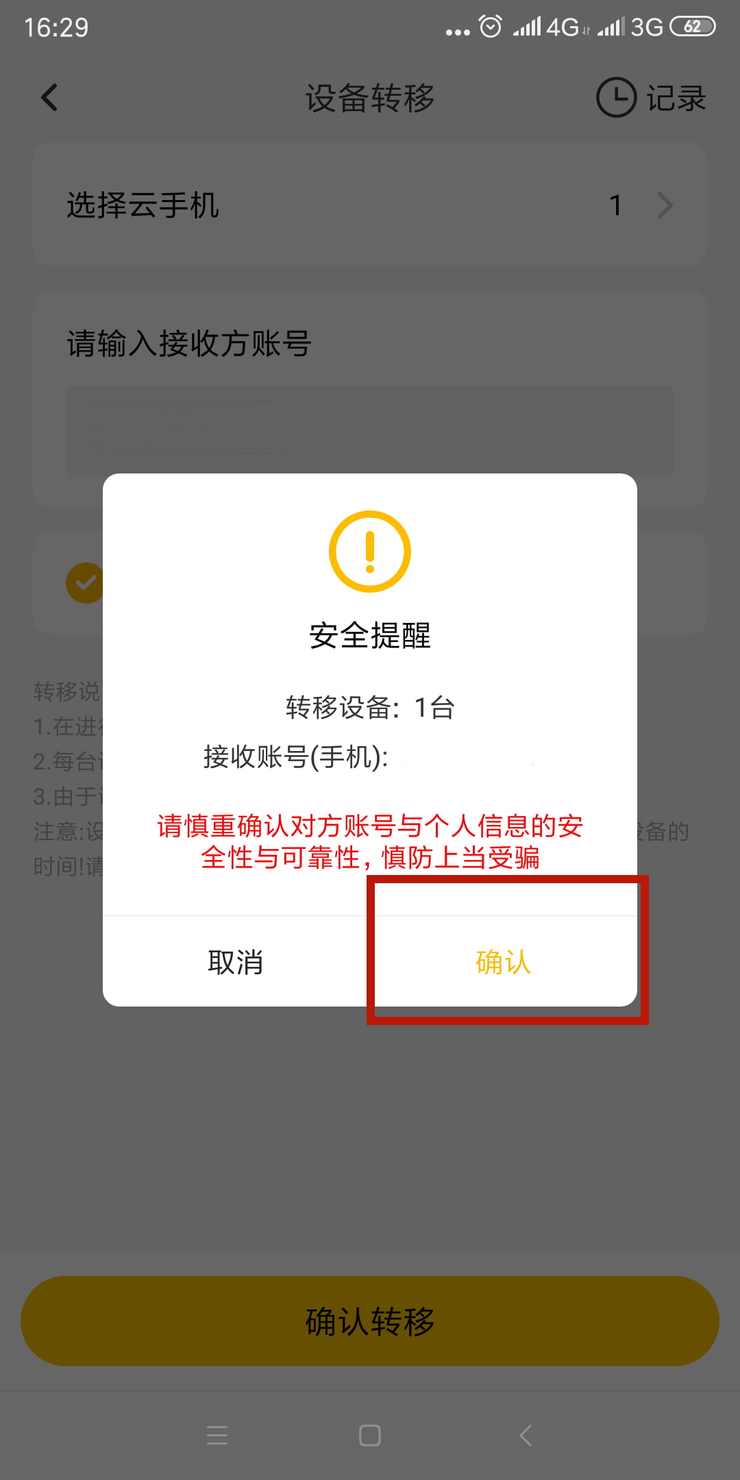 3、选择需要接收设备的账号(可以是账号ID或者手机号码),再输入安全密码,点“确认转移”,转移时会有提示,点确定即可。