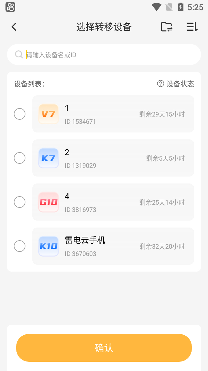 2、选择你需要转移的云手机,勾选以后点确定,可以通过搜索来找到对应设备