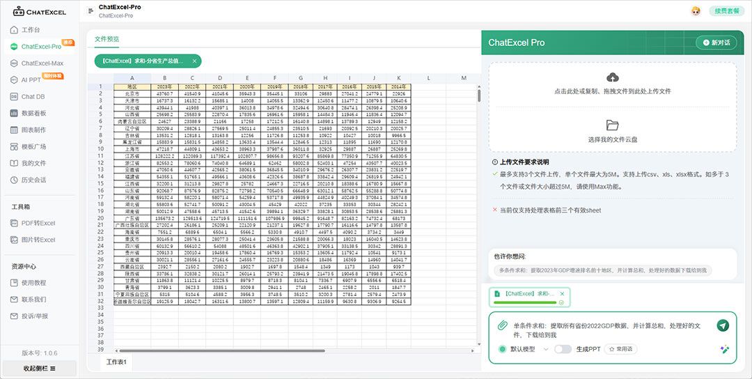 只用ChatExcel工具,PDF、PNG、JPG、JPEG转Excel,多种格式随便转换!将文件直接拖拽进去,就可以看到转换进度。