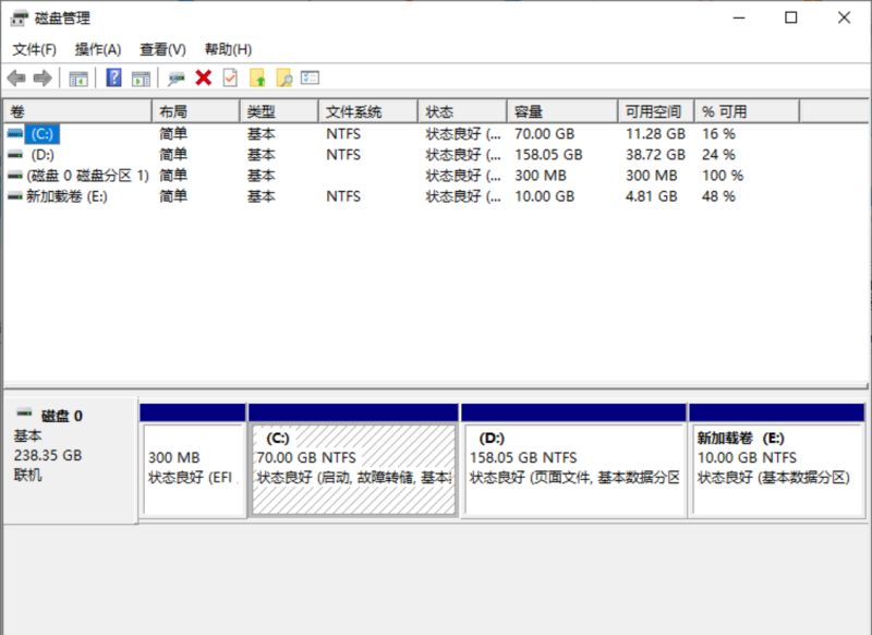 6、磁盘管理界面,可以对C盘D盘添加新的分区,可以调整新的容量