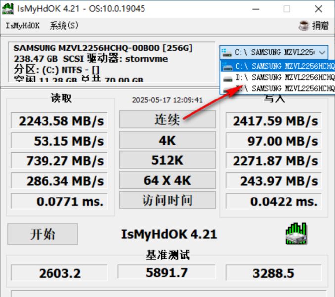 8、分区切换,在软件设置D盘测试,在软件设置E盘测试,测试结束就可以显示读写速度
