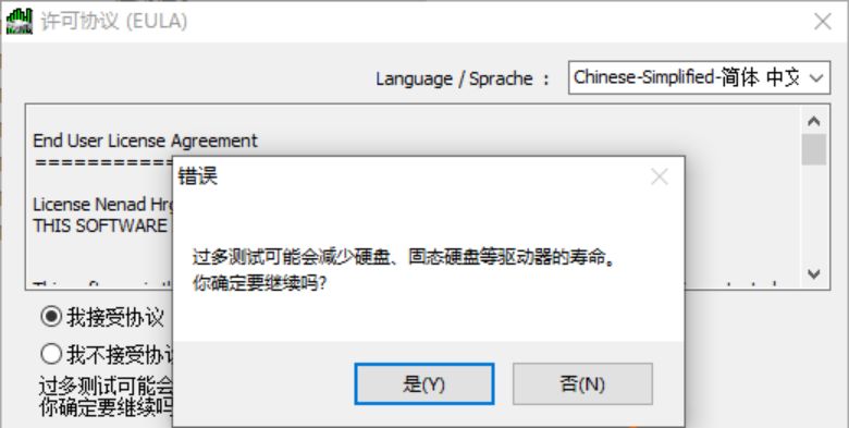 1、将IsMyHdOK软件启动,过多测试可能会减少硬盘、固态硬盘等驱动器的寿命。你确定要继续吗?
