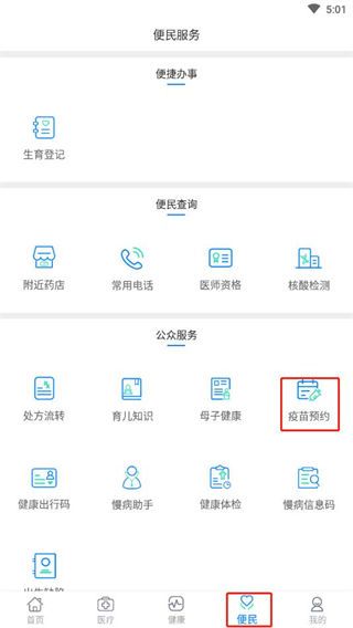 3、如果取消不了,可以点击便民,进入便民服务页面后选择公众服务里的疫苗接种。
