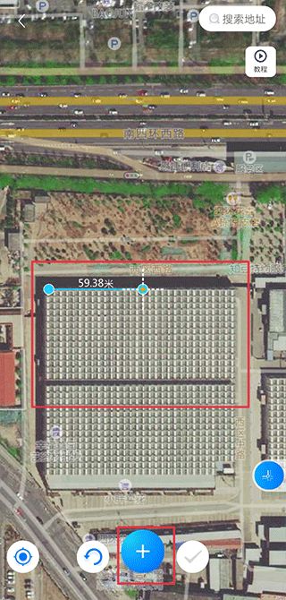 3、再地图上找到并放大需要测量的区域,并使用中间蓝色+号在测量区域周围点一圈。
