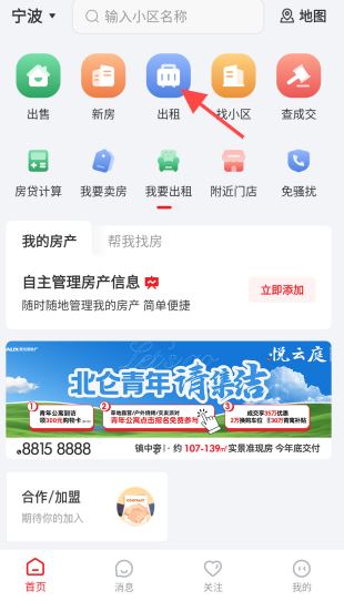 2、进入首页,点击【出租】图标,也可浏览“出租房源”信息。