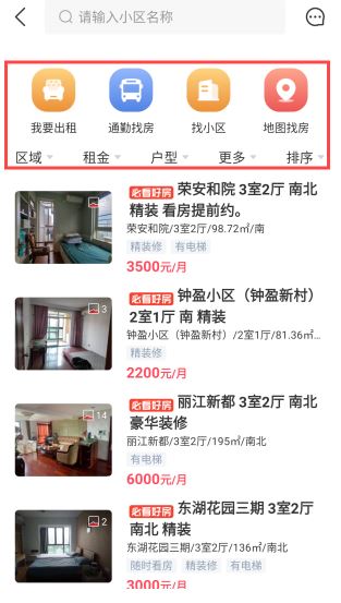 3、设置区域、租金等筛选条件,或使用通勤找房、找小区等功能。