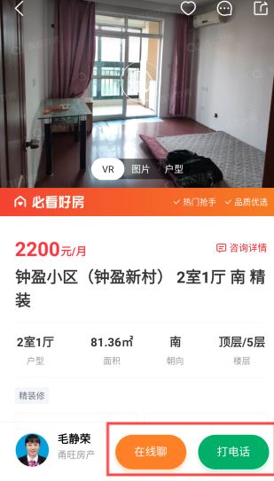 4、查看心仪房源信息,选择【在线聊】或【打电话】沟通,也可预约看房。