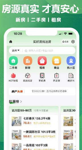 达房网app是一款为达州当地用户提供房地产信息的租房买房应用软件,软件支持用户可以在线租售自己需要的房产,这里海量真实的房源信息都可以进行查看,用户可以在线看房找房,各种新房、二手房应有尽有,让你可以在线租售,找到自己需要的房源进行交易,轻松的买房。
