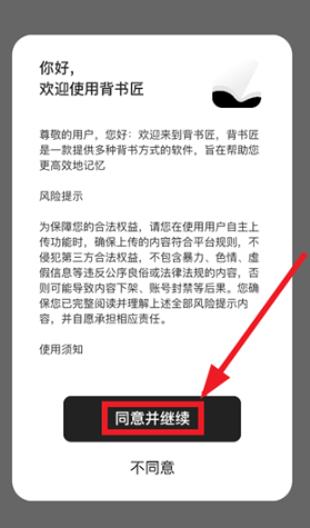 下载安装并打开背书匠app,在你好,欢迎使用背书匠提示界面点击同意并继续
