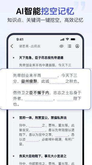 1、高效智能:背书匠app利用AI技术实现智能切割、总结、出题和监督背诵等功能,提高背诵效率。