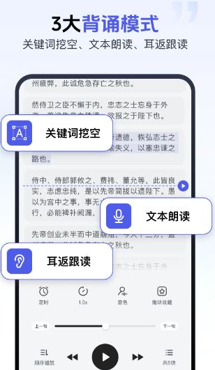 包含朗读文本、耳返背书等功能,视觉、听觉双感官加强记忆