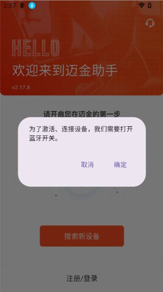 1、打开app先进行注册登录,然后打开手机蓝牙、启动需要连接的设备,接着就可以点击app中的【搜索新设备】按钮