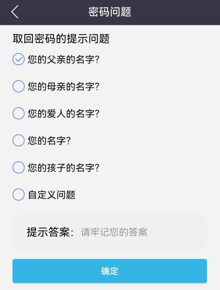 4、然后选择密码问题,里面没有想要的问题也可以自定义问题,然后输入答案,完成后点击【确定】。