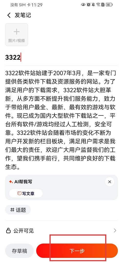 3、输入笔记标题和内容,有需要还可以上传视频,编辑好后,点击【下一步】;