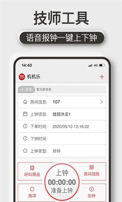 机机乐技师端是一款足浴按摩行业的足浴技师用来上班考勤、技师上下钟、加钟更改项目、查询目前业绩或历史业绩的应用,可以及时查询预约情况、查询自己的考勤记录。