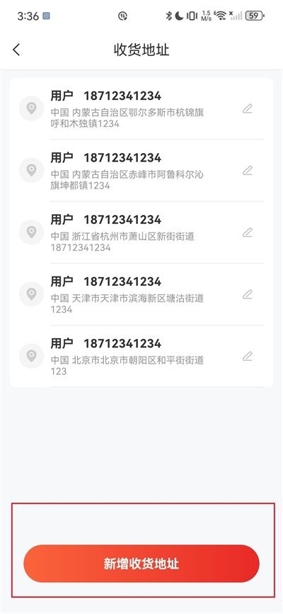 3、 在收货地址页面底部,点击橙色"新增收货地址"按钮,进入新增地址页面;