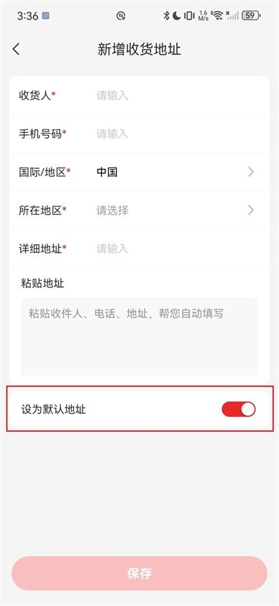 4、 在新增收货地址页面,填写好个人信息,可选择开启"设为默认地址"开关,将该地址设为默认收货地址,确认信息填写完整后,点击底部"保存"按钮,完成收货地址添加。