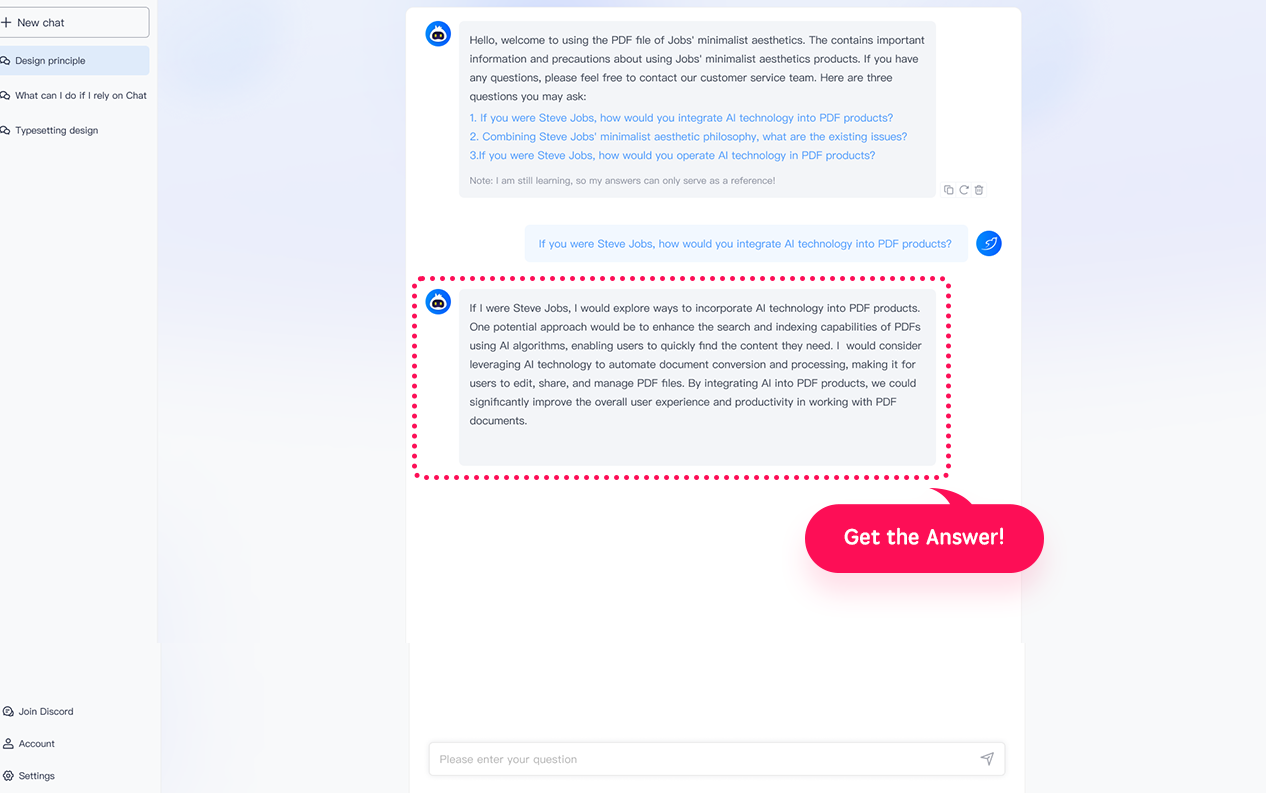 ● 向聊天机器人询问有关您的文件的问题,它会用引用的来源回答您